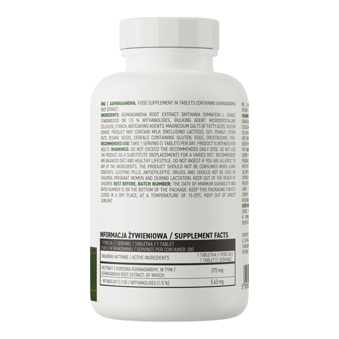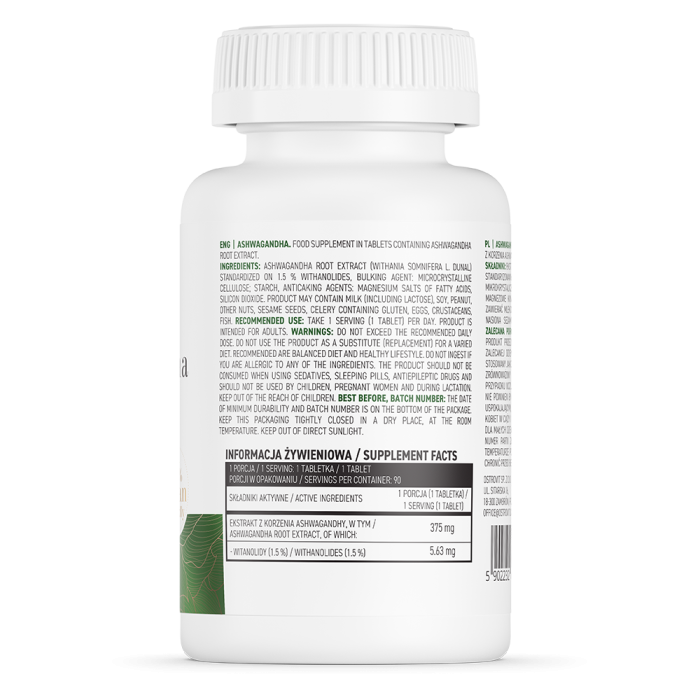 Ashwagandha jest popularnym ekstraktem z korzenia Ashwagandhy (Withania somnifera), znanej również jako żeń-szeń indyjski lub wiśnia zimowa. To tradycyjne zioło wschodnich kultur jest standaryzowane do 1,5% witanolidów, których zawiera do 10 mg w pojedynczej dawce dziennej.