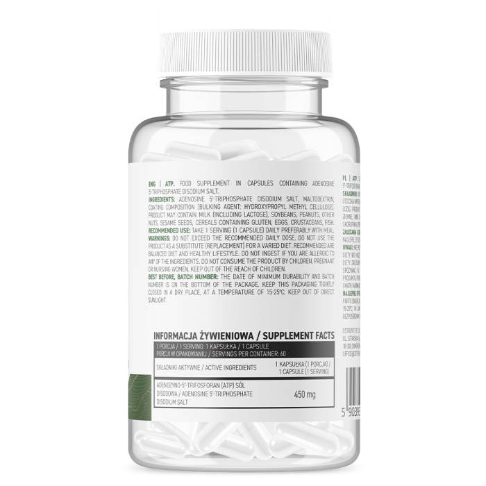 ATP to suplement funkcjonalny dla sportowców zawierający ATP czyli adenozynotrójfosforan. Substancja ta naturalnie występuje w organizmie. Jest wytwarzana w komórkach podczas złożonych procesów metabolicznych, szczególnie z węglowodanów lub tłuszczów, które pobieramy z pożywieniem. Jest głównym źródłem energii komórkowej, która napędza podstawowe procesy organizmu. Obejmują one skurcz mięśni, transmisję nerwową lub funkcjonowanie mózgu. Dlatego też ilość ATP w organizmie jest związana z wydajnością fizyczną i psychiczną.