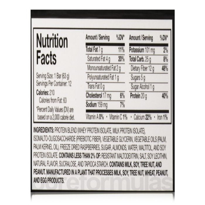 Smak Chocolate brownie: mieszanka białkowa (izolat białka serwatkowego, izolat białka mleka), izomalto-oligosacharydy (włókno prebiotyczne), kawałki czekolady (likier czekoladowy przetwarzane alkalicznie), cukier, masło kakaowe, wanilia, gliceryna, oleje roślinne (olej palmowy, z ziaren palmy), cukier, migdały, woda, izolat białka soi, maltitol, kakao (przetwarzane alkalicznie), zawartość poniżej 2%: maltodekstryna, sól, lecytyna sojowa, aromaty naturalne, sukraloza, wanilia, skrobia tapioki.