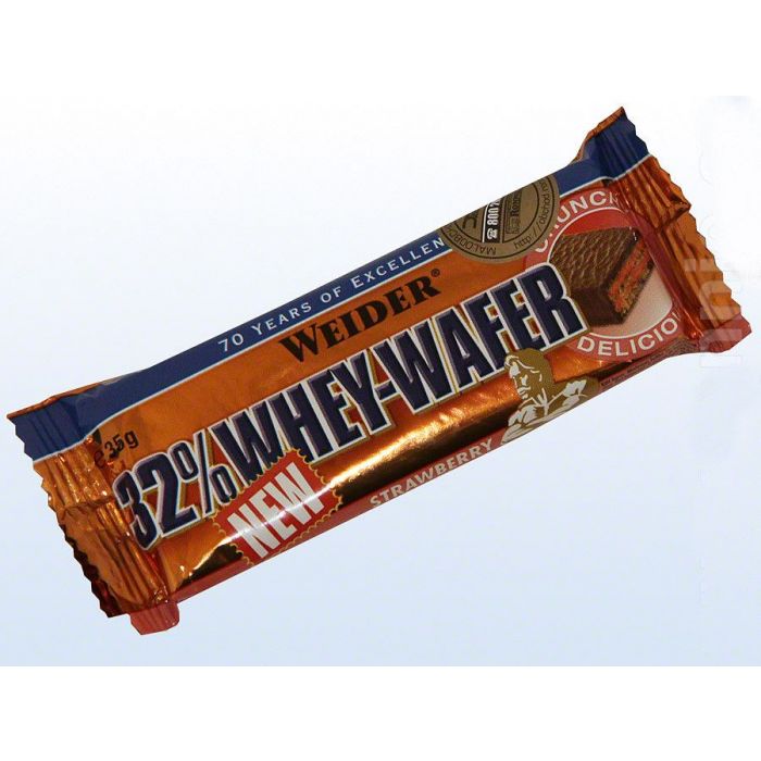 32% Whey Wafer Bar to baton proteinowy z 32% zawartością białka, który dociera do wyczerpanych mięśni z maksymalną prędkością i wspomaga procesy anaboliczne w komórkach mięśniowych. Dostarcza organizmowi odpowiednią ilość energii. Każdy baton zawiera 180 kcal i jest uważany za jeden z najskuteczniejszych suplementów potreningowych. Jest idealny dla każdego, kto chce zwiększyć swoją masę mięśniową. Należy do najlepszych dzięki pysznemu smakowi, ponadto nie obciąża układu pokarmowego. 32% Whey-Wafer to połączenie chrupiącego gofra o zawartości wysokiej jakości białka z rozpływającą się w ustach polewą czekoladową, po prostu rarytas!