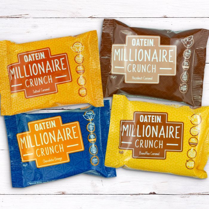 Batonik proteinowy Millionaire Crunch to smakowity batonik z małą zawartością cukru i 15 g białka roślinnego. Białko jest potrzebne dla zachowania masy mięśniowej i jej wzrostu, jak i również dla zachowania zdrowych kości. Batonik proteinowy Millionaire Crunch jest naturalnie bezglutenowy, nie zawiera oleju palmowego oraz jest odpowiedni dla wegan i wegetarian. Pomimo tego, że ma doskonałe słodki smak, zawiera tylko 214-216 kcal, w zależności od smaku.