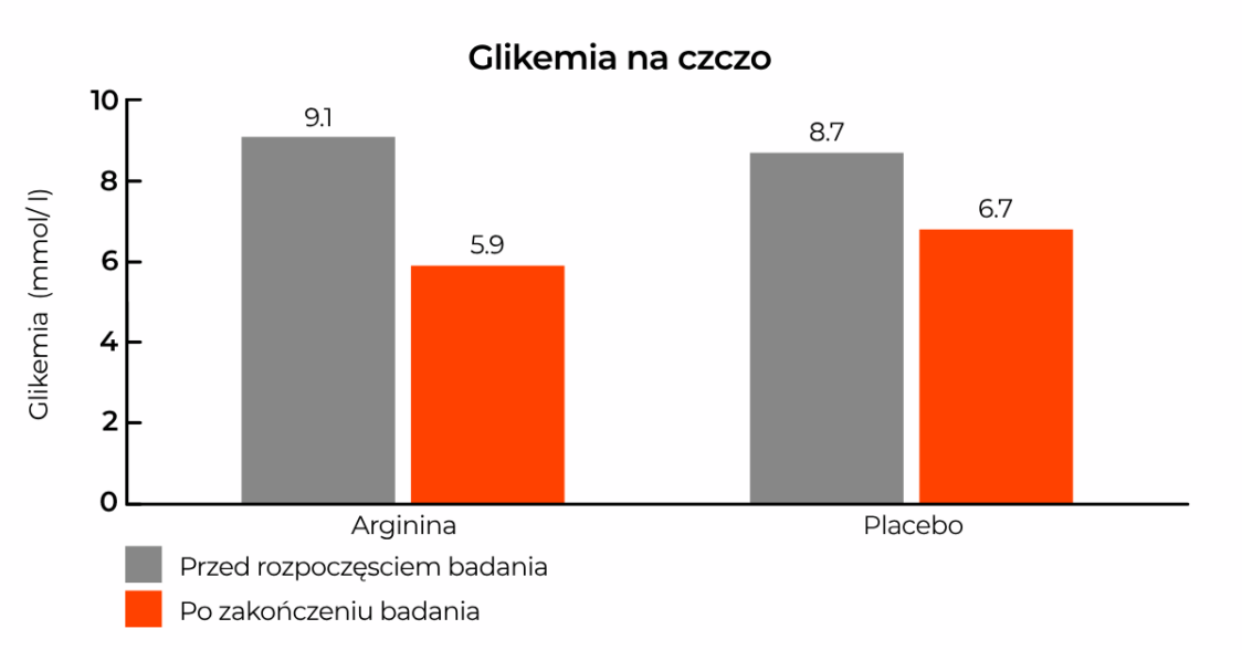 Związek między argininą a poziomem cukru we krwi wykazano również w badaniu 33 osób z otyłością i cukrzycą typu 2. Uczestnicy stosowali niskokaloryczną dietę i zalecany program treningowy przez 21 dni, przy czym połowa z nich przyjmowała 8,3 g argininy dziennie, a pozostali otrzymywali placebo. Poziom cukru we krwi mierzono przed, w trakcie i po zakończeniu programu. Okazało się, że poziom glukozy na czczo spadł znacznie bardziej u osób przyjmujących argininę niż u osób otrzymujących placebo. [5]