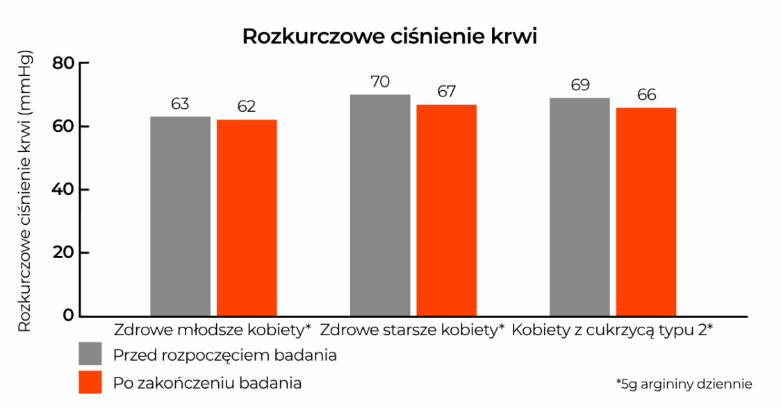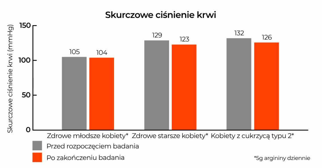 Wszyscy uczestnicy przyjmowali 5 g argininy dziennie przez dwa tygodnie. Naukowcy zmierzyli skurczowe i rozkurczowe ciśnienie krwi na początku i na końcu każdej obserwacji. Ostatecznie okazało się, że znaczące obniżenie ciśnienia skurczowego i rozkurczowego wystąpiło zarówno u zdrowych kobiet w starszym wieku, jak i u kobiet z cukrzycą. [1]