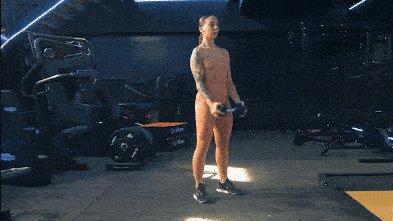 Trzymaj hantle w każdej ręce i unieś ręce z lekko ugiętymi łokciami tak jak w wariancie podstawowym. Następnie zrób wydech, unosząc hantle nad głowę.