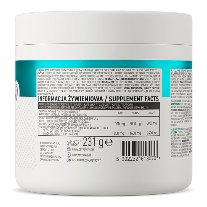 CLA to sprzężony kwas linolowy, który w jednej dawce zawiera 800 mg tego popularnego naturalnego spalacza tłuszczu. CLA jest nienasyconym kwasem tłuszczowym omega-6, który pomaga w utrzymaniu prawidłowego poziomu cholesterolu we krwi.