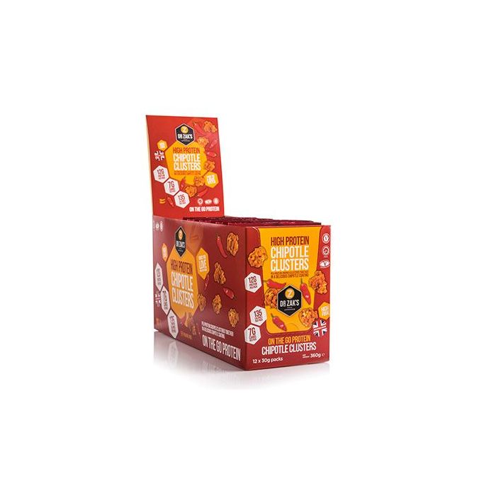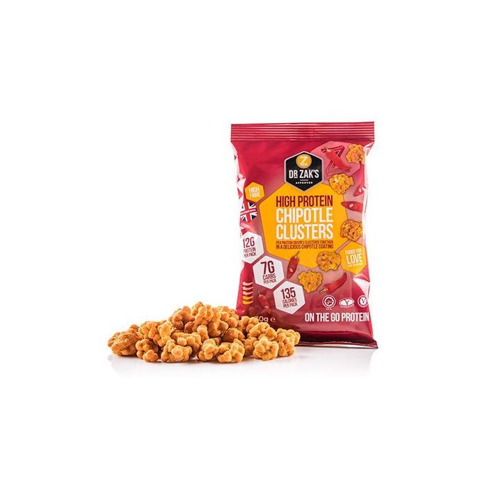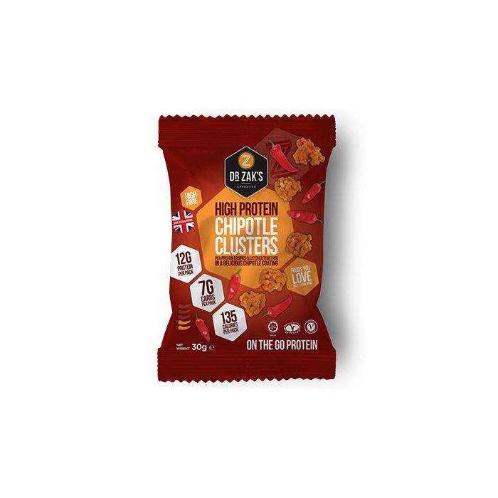 High Protein Clusters są cukierkami z wysoką zawartością białka, które nadają się do spożywania o dowolnej porze dnia. Małe, kruche, chrupiące, aromatyzowane kulki są bogatym źródłem białka - aż 12 gram izolatu białka grochowego w opakowaniu (zdumiewające 41% zawartości białka). Nie zawierają oleju palmowego i są odpowiednie również dla wegetarian. Znajdziesz wśród nich trzy wersje smakowe, czekoladową, owocowo-jogurtową oraz niesłychanie pikantną - wędzonego chili, spośród których z pewnością wybierzesz swoją ulubioną.