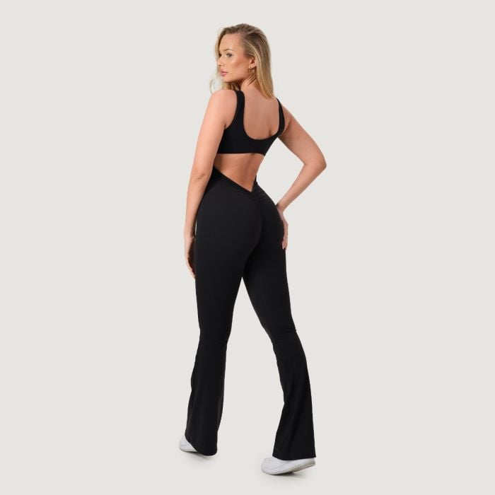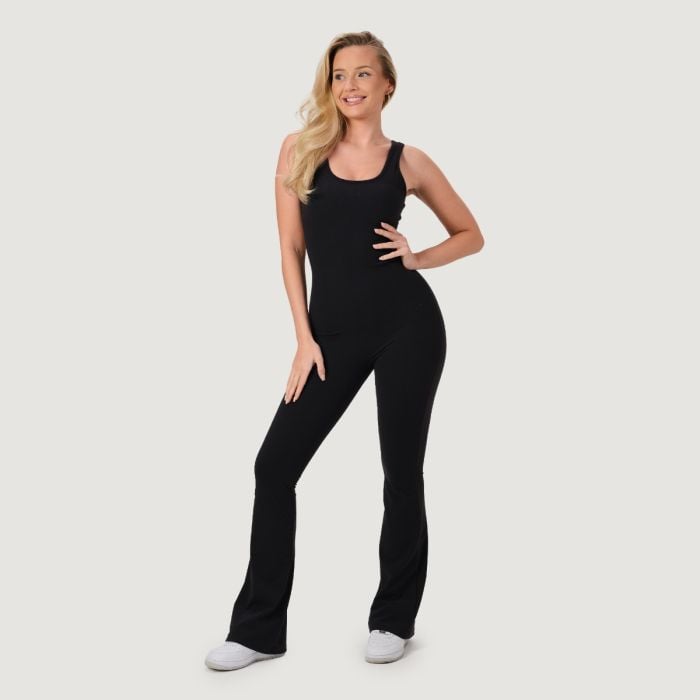 Ten sportowy, nieprześwitujący kombinezon bez rękawów z okrągłym dekoltem wyróżnia się przemyślanym designem i dopasowanym krójem slim, który idealnie podkreśla sylwetkę. Długie legginsy z popularnym rozszerzanym wykończeniem (nogawki flared) optycznie wydłużają nóg, podczas gdy efekt scrunch butt z tyłu pięknie modeluje i eksponuje pośladki. Brak szwu przedniego gwarantuje maksymalny komfort bez nieprzyjemnego dyskomfortu.