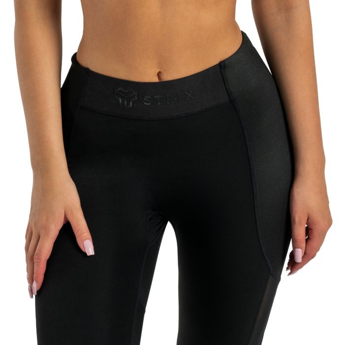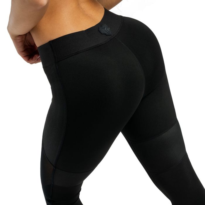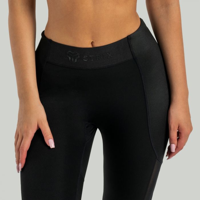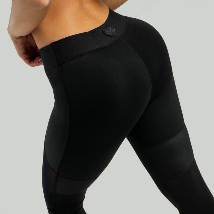 Tworząc te legginsy nie poszliśmy na skróty pod względem designu i kroju. Na pierwszy rzut oka urzekają one swoją wielowarstwową tkaniną po bokach, która zapewnia im dodatkową wytrzymałość i trwałość. Dodatkowo, częściowo zakrywają one elastyczny pas, co nadaje im oryginalnego wyglądu. Panele wykonane są ze specjalnie przetworzonej tkaniny, która nadaje tym legginsom atmosferę luksusu. Po bokach panele są uzupełnione kawałkami przezroczystej tkaniny siatkowej, która gustownie odsłania odrobinę skóry. Ta cecha sprawia również, że legginsy są ogólnie bardziej oddychające, co jest ważną właściwością, jeśli chodzi o funkcjonalną odzież sportową. Wszystkie kobiety, które stawiają swoim ubraniom wysokie wymagania, szczególnie docenią fakt, że legginsy są wykonane bez przedniego szwu. Oznacza to brak niewygodnego klinowania się w częściach intymnych. Dzięki tym spodenkom poczujesz komfort, pewność siebie i motywację, by dać z siebie wszystko.