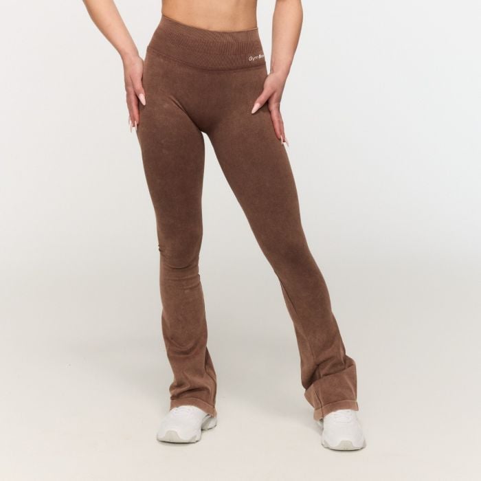Te funkcjonalne legginsy z efektem sprania zawierają design push-up i scrunch butt, który idealnie modeluje pośladki. Dzięki dopasowanemu krojowi oraz prążkowanemu wysokiemu stanowi pięknie podkreślają sylwetkę i uwydatniają krągłości. Od kolan w dół legginsy typu push-up stopniowo rozszerzają się, tworząc popularny krój flare. Jednocześnie zachowują minimalistyczny wygląd i łatwo łączą się z innymi elementami odzieży sportowej. Załóż te modne legginsy z rozszerzaną nogawką i ciesz się uczuciem pewności siebie oraz komfortu podczas każdego treningu.
