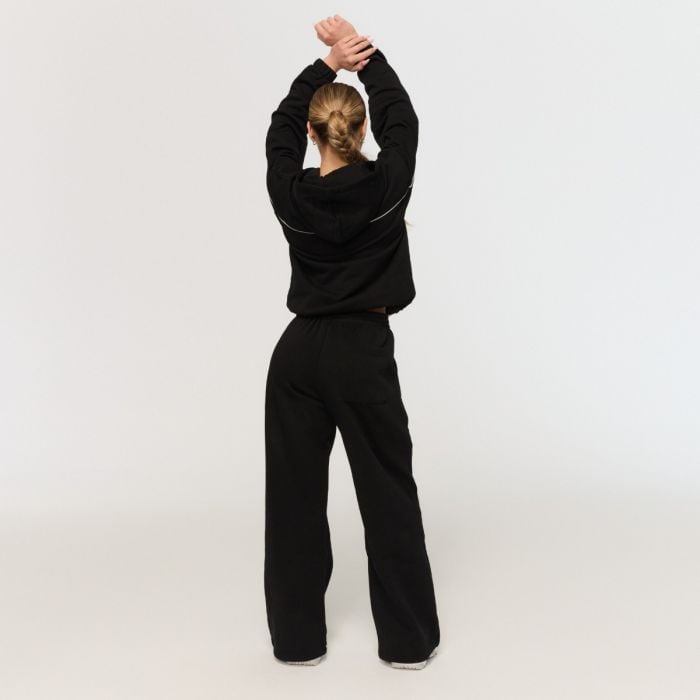 Te spodnie dresowe do wypoczynku wyróżniają się krojem z szerokimi nogawkami. Są one ozdobione po bokach subtelnymi kontrastowymi lamówkami, które optycznie wydłużają nogi i nadają całości stylowy retro akcent. Nogawki zakończone są sznurkiem, co pozwala nosić spodnie dresowe na dwa sposoby: jako luźne, szerokie spodnie lub ściągnięte przy kostkach, tworząc bardzo popularny efekt "parachute".