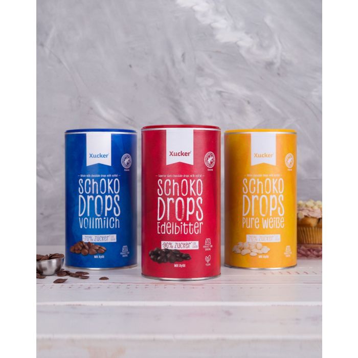 White Chocolate Drops to kawałki białej czekolady bez dodatku cukru, które są słodzone wyłącznie ksylitolem. Kawałki czekolady idealnie nadają się do wypieku ciasteczek, babeczek, ciast, robienia polew czekoladowych, domowej roboty musli, ale nadają się również do aromatyzowania owsianki czy jogurtu.