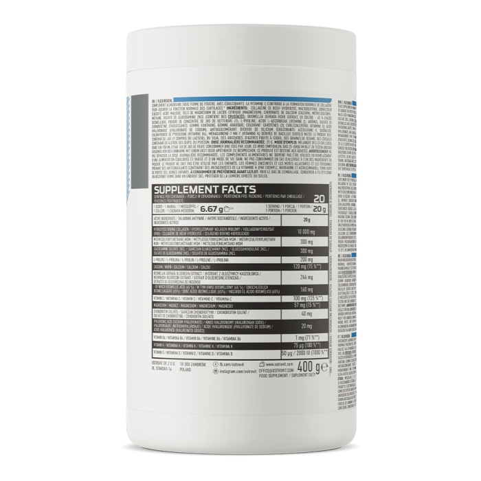 Produkt zawiera ekstrakt z palmy sabałowej (Boswellia serrata), która jest związana z dbałością o zdrowie stawów. Należy jednak wspomnieć również o kwasie hialuronowym, który jest związany z nawilżeniem chrząstki. Następnie jest wapń, który wspiera prawidłowe funkcjonowanie mięśni i wraz z magnezem przyczynia się do utrzymania zdrowych kości. Produkt zawiera także różne witaminy i minerały, wśród których szczególnie wyróżnia się witamina C. Przyczynia się ona do prawidłowego tworzenia kolagenu i prawidłowego funkcjonowania kości czy chrząstek. Suplement ten docenią sportowcy, miłośnicy aktywnego trybu życia, a także każdy, kto chce zadbać o swój układ mięśniowo-szkieletowy. Można go wymieszać z wodą, sokiem lub ulubioną lemoniadą.