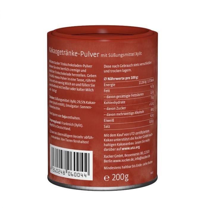 Hot chocolate to kremowa gorąca czekolada w formie proszku bez cukru. Jej zaletą jest to, że jest bezcukrowa, ponieważ jest słodzona wyłącznie ksylitolem. Ksylitol jest znanym środkiem słodzącym występującym w owocach i warzywach, ale jest również dodawany do gum do żucia. W porównaniu do zwykłego cukru, ksylitol zawiera mniej kalorii. Przygotuj sobie gorący napój w domu, który jest również wolny od GMO i przyjazny dla wegan.
