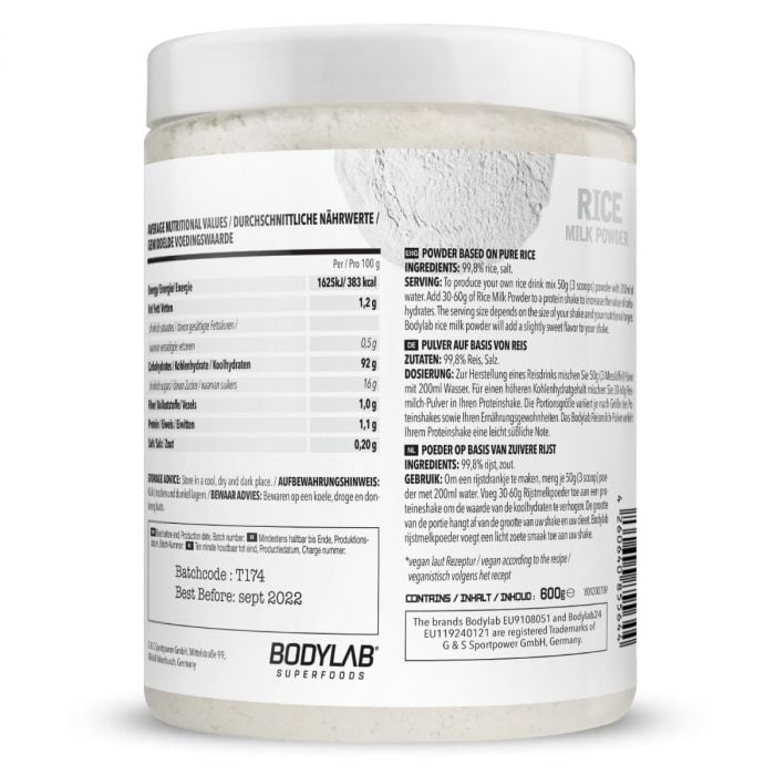 Mleko Ryżowe w Proszku to łatwo rozpuszczalne źródło węglowodanów, które świetnie nadaje się do wzbogacenia szejków proteinowych lub jako alternatywa dla mleka. Zawiera 99,8% ryżu, tylko 0,2 g soli i minimalną ilość tłuszczu. Nie zawiera dodatku cukru, laktozy, sztucznych konserwantów, barwników ani słodzików. Nadaje się również dla wegan.