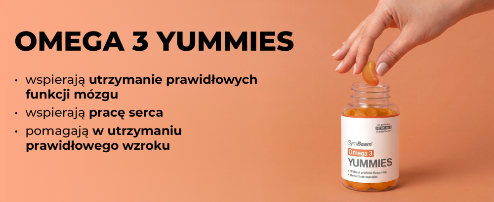 Omega 3 Yummies to pyszne żelki o smaku pomarańczowym, które sprawiają, że każda dawka kwasów tłuszczowych omega-3 jest przyjemnością. Zawierają olej rybi, który jest źródłem niezbędnych kwasu eikozapentaenowego (EPA) i kwasu dokozaheksaenowego (DHA). Każda porcja, która równa się czterem żelkom, dostarcza 246 mg tych zdrowych tłuszczów, w tym 162 mg DHA i 35 mg EPA. Pokochasz te żelki również dlatego, że nie mają typowego posmaku oleju rybiego.