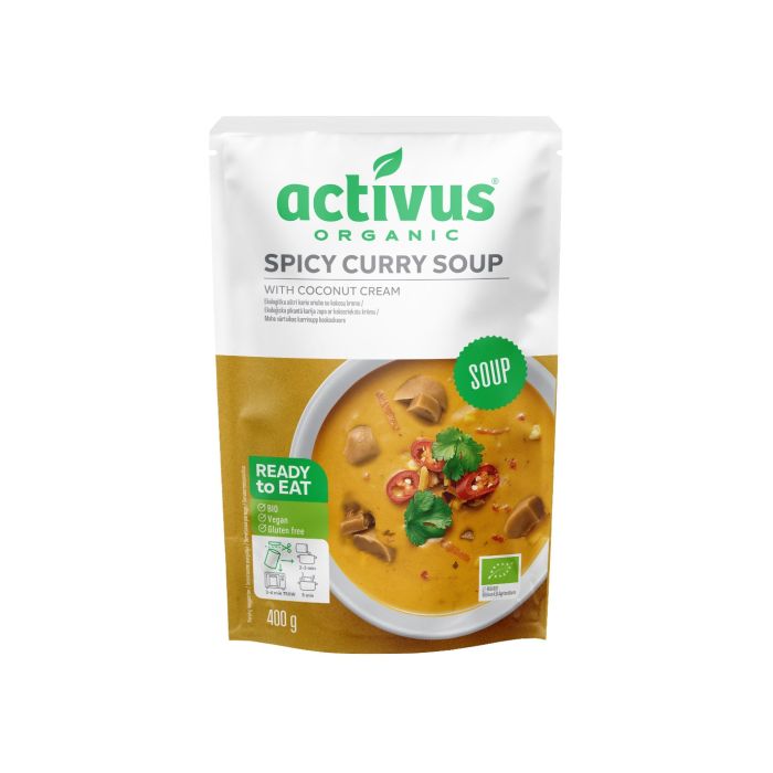 Organiczna pikantna zupa curry jest gotowa do natychmiastowego spożycia i zawiera jedynie bio, wegańskie składniki