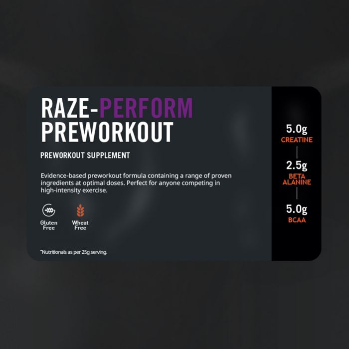 Raze-Perform™ zawiera kofeinę dla zwiększenia poziomu energii oraz kreatynę dla wsparcia wydajności podczas krótkich, następujących po sobie ćwiczeń