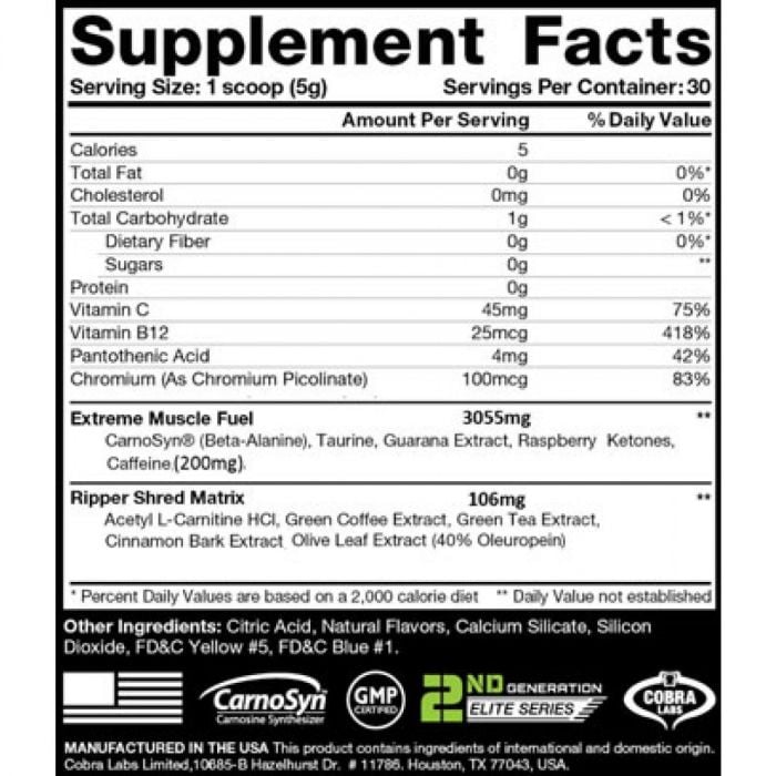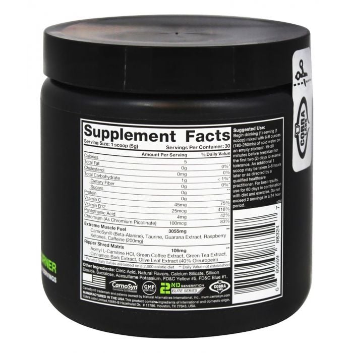 The Ripper to spalacz tłuszczu, który docenią zarówno kobiety, jak i mężczyźni. Zawiera kilka funkcjonalnych składników, w tym 2 doładowane kompleksy. Pierwszy z nich nazywa się Muscle and Focus Matrix i zawiera beta-alaninę, ekstrakt z guarany, ketony malinowe i kofeinę, która promuje koncentrację. Kofeina, przyjmowana w dawce 3 mg na kg masy ciała na około godzinę przed ćwiczeniami, przyczynia się również do zwiększenia wydajności wytrzymałościowej. Drugi kompleks nosi nazwę Shred and Mood Enhancer Matrix i zawiera taurynę, acetylo-L-karnitynę HCl oraz ekstrakty z zielonej kawy, zielonej herbaty, kory cynamonu lub liści oliwnych.