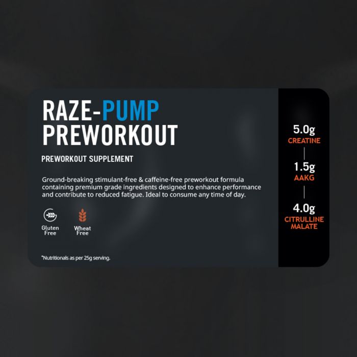 Stymulant przedtreningowy Raze-Pump™ jest przeznaczony dla wszystkich sportowców, którzy chcą uzyskać jak najwięcej ze swojego treningu. Zawiera kilka aktywnych składników, takich jak N-acetyl L-karnityna, beta-alanina, jabłczan cytruliny czy monohydrat kreatyny w celu zwiększenia wydajności podczas krótkich, następujących po sobie ćwiczeń.