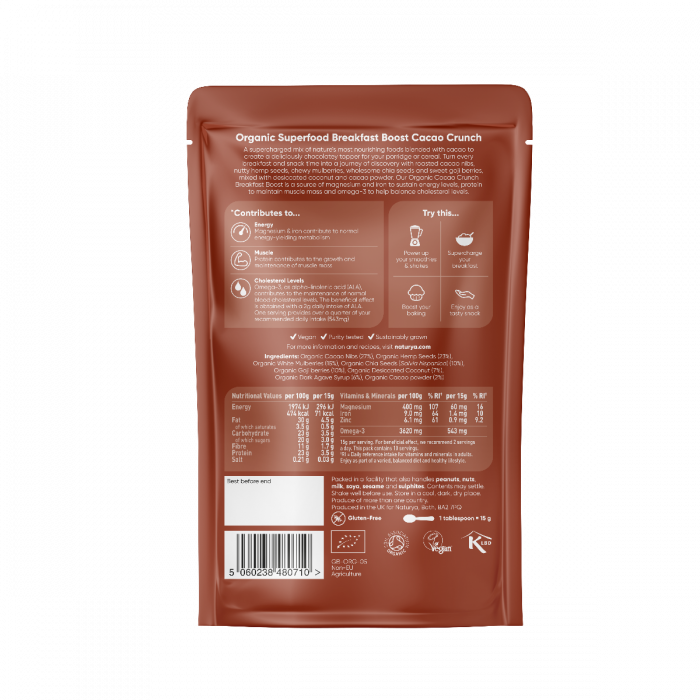 Superfood Breakfast Boost Cacao Crunch to wyjątkowe źródło białka, błonnika, kwasów tłuszczowych omega-3 i minerałów. Zawiera tylko i wyłącznie organiczne składniki, takiej jak zmielone kakao, jagody goji, konopie, nasiona chia oraz białą morwę.