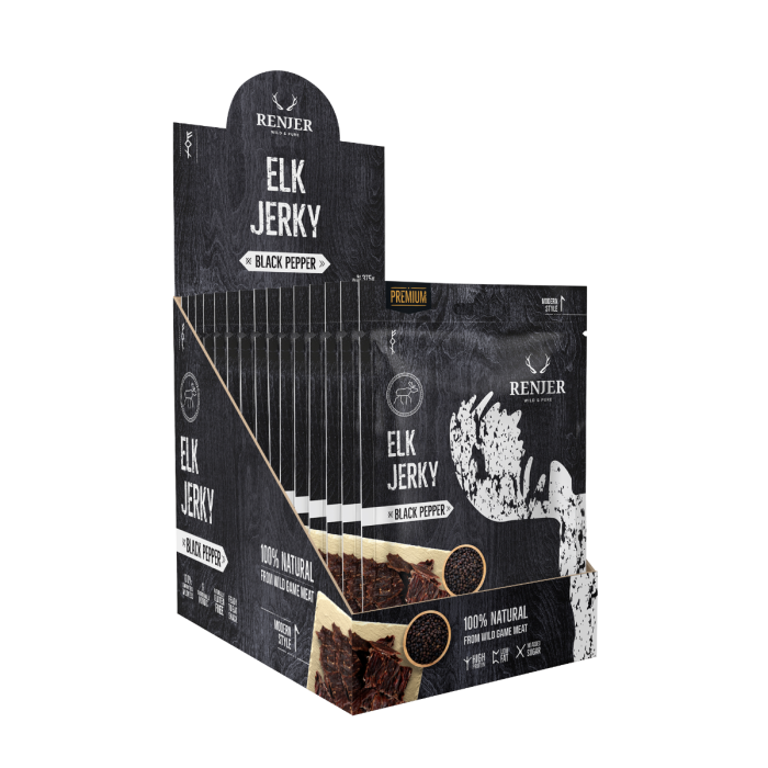 Elk Jerky to doskonała przekąska dla każdego miłośnika mięsa. Urzeka ciekawym aromatem, który jest prekursorem perfekcyjnie pysznego smaku. Osiągnięto to dzięki delikatnemu procesowi suszenia i starannie dobranym przyprawom, które czynią z niego prawdziwy przysmak. Kolejną cechą jest jego profil odżywczy, który szczyci się niską zawartością tłuszczu i wysoką zawartością białka, która promuje wzrost i utrzymanie mięśni.