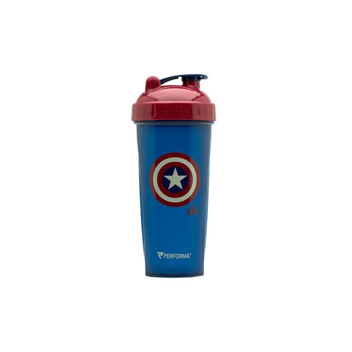 Performa Captain America to wysokiej jakości szejker mający 800 ml pojemności. Możesz trenować jak prawdziwy superbohater mając oryginalny szejker edycji Performa z logo komiksowych superbohaterów ! Jest on wyprodukowany z wolnego od BPA, bezpiecznego tworzywa sztucznego i z zastosowaniem barwników do żywności. Może być myty w zmywarce, a nowa, ulepszona technologia mieszania napojów zapewnia idealne wymieszanie bez grudek i bryłek.