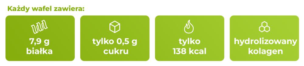W przeciwieństwie do zwykłych słodyczy, ten wafel proteinowy jest pełen wartościowych składników odżywczych. Charakteryzuje się wysoką zawartością białka, pochodzącego z izolatu serwatki i wysokiej jakości kolagenu. Dzięki ich obecności przyczynia się do wzrostu i utrzymania mięśni, a także do zdrowia kości. Ma również niską zawartość cukru, a nacisk na jakość potwierdza również użycie starannie wyselekcjonowanych składników.