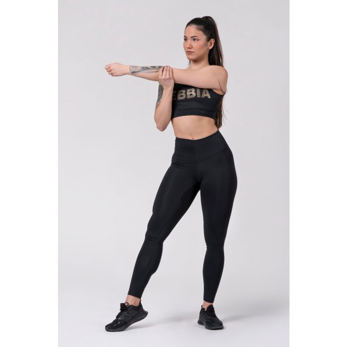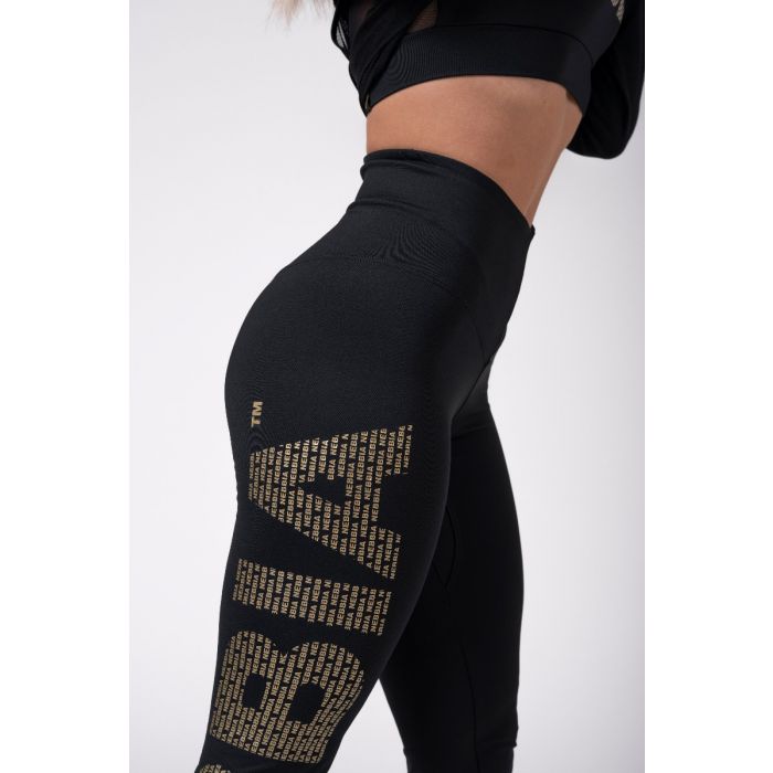 Intense Gold Print w kolorze czarnym to stylowe legginsy damskie z wysoką talią i unikalnym przeszyciem, dzięki któremu doskonale dopasowują się do ciała i podkreślają sylwetkę. Dodatkowo legginsy są z efektem scrunch butt, który ma za zadanie modelować pośladki. Eleganckie, czarne legginsy ozdobione są złotym logo Nebbia. Zakochasz się w niezwykle wytrzymałym, elastycznym i jednocześnie bardzo wygodnym materiale podczas treningu, HIIT, biegania, jazdy na rowerze czy łyżwach.